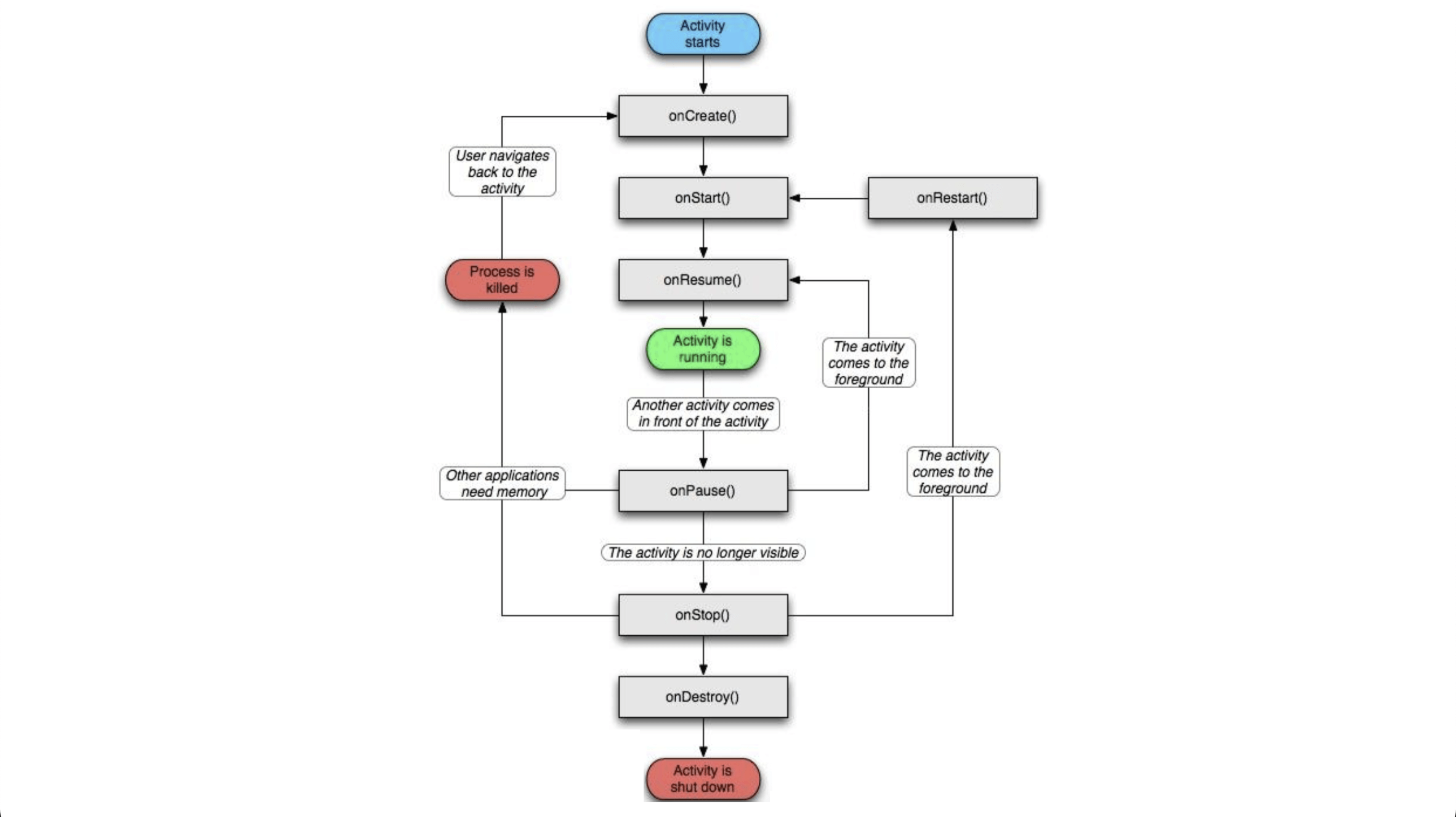 • 作用: 释放那些在 Activity 不可见时不再需要的资源。重量级 CPU 操作,例如向数据库写入数据,应该在这里完成。