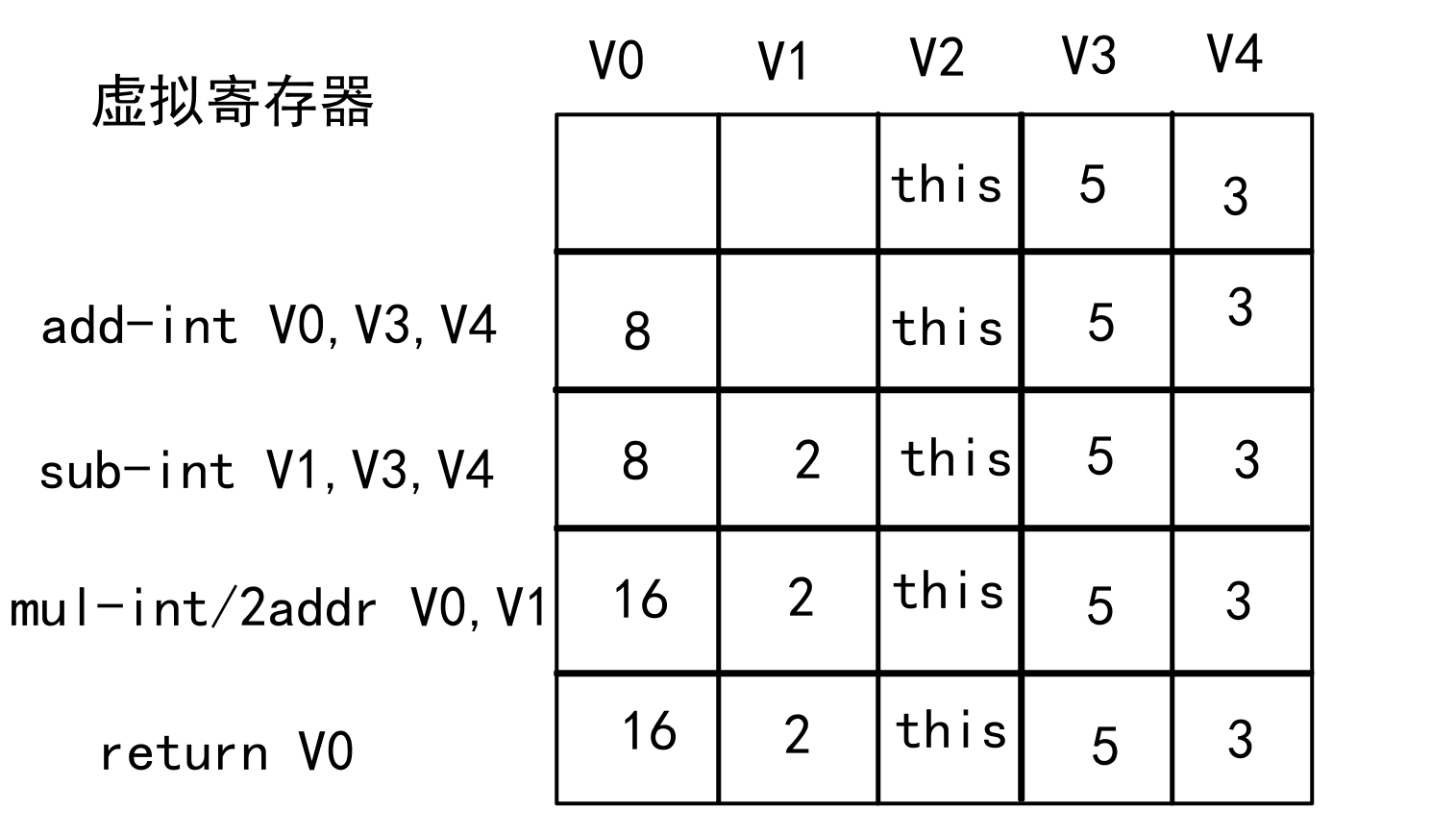 Dalvik虚拟机使用基于寄存器的指令集,这意味着大多数操作都是通过寄存器来完成的。还是上面同样的计算方法: