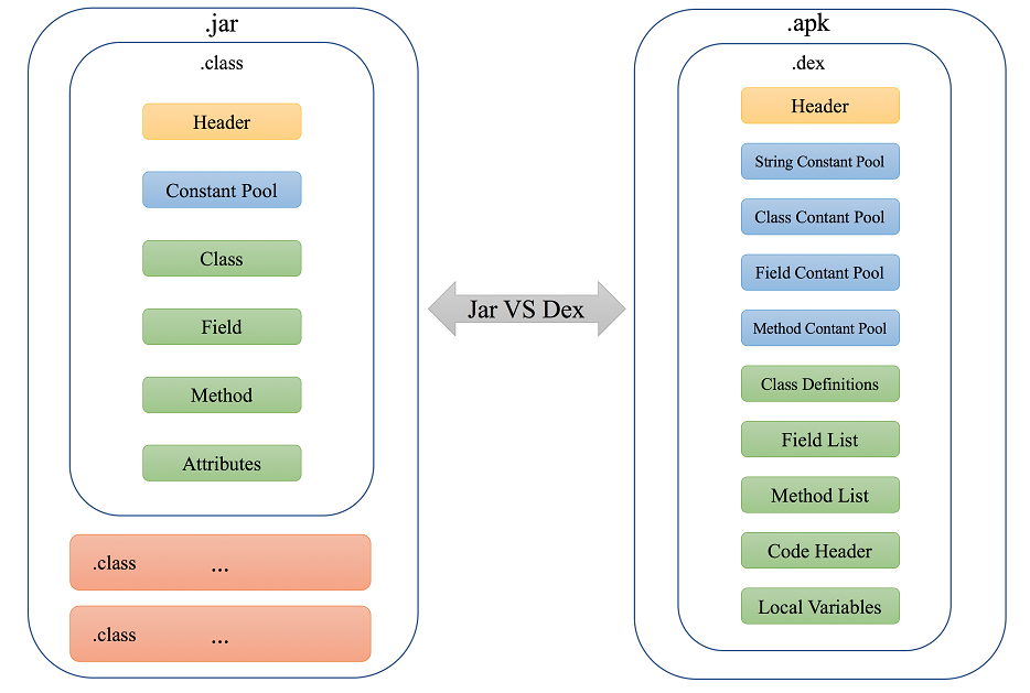 - 重新编码数据: class文件中的数据会被重新编码为dex格式。这包括将Java字节码转换为Dalvik字节码,以及重新组织类、方法和字段的结构。