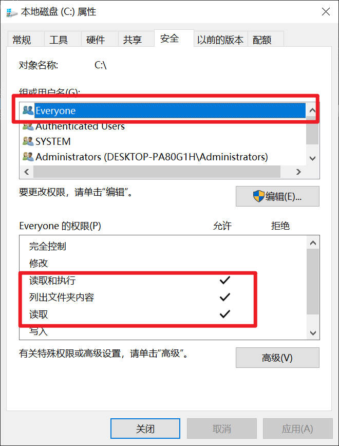 确保“Everyone”用户或特定用户的权限已设置为“读取”或“完全控制”。