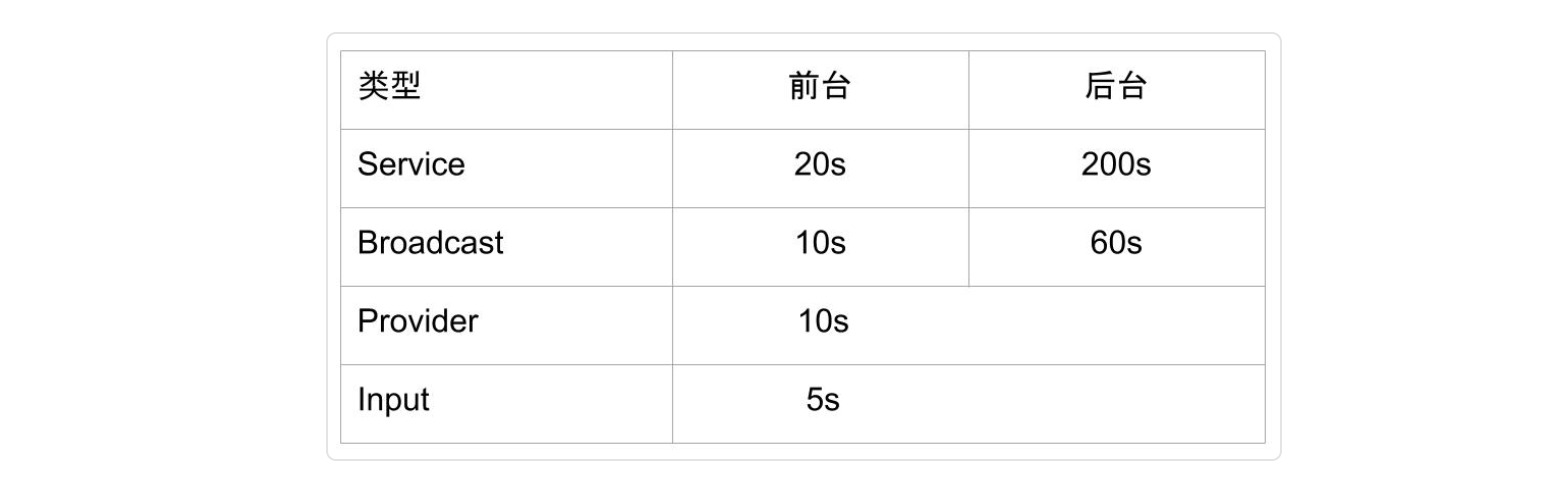 可以看到,ANR的判定时间和前台后台强相关,差距很大,通常在前台的app会有更严格的限制。
