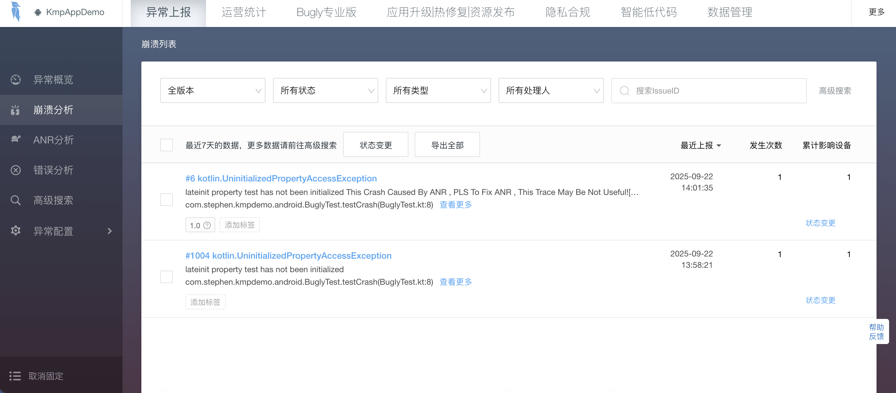 在文字被点击时,会触发fatalError,从而上报一个崩溃。也可以使用KMP内部实现的 BugCreate_iosKt.createACrash() 方法来手动上报一个崩溃。