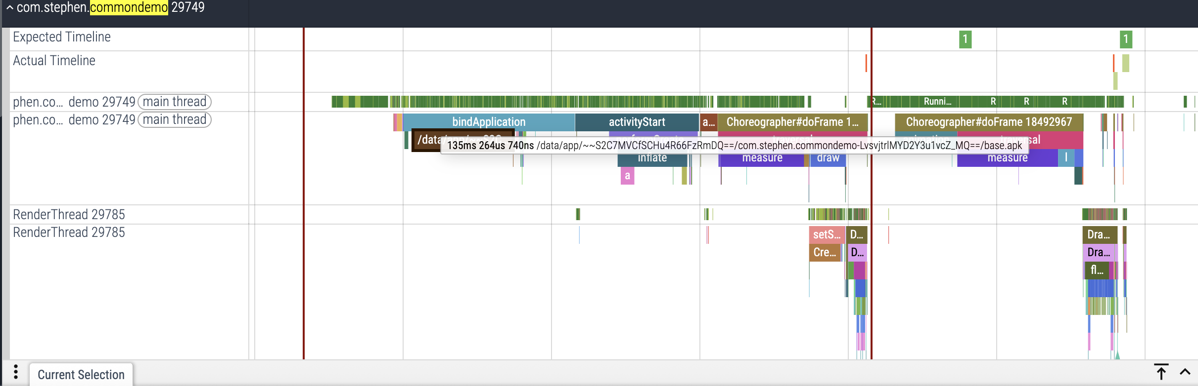展开 Choreographer#doFrame 并查看其内部的调用栈,可以帮助你精确定位是哪个方法哪个组件导致了耗时。 特别关注那些在 onCreateonStartonResume 中被调用,并且在 Choreographer#doFrame 范围内占用大量主线程时间的自定义方法或第三方 SDK 初始化。