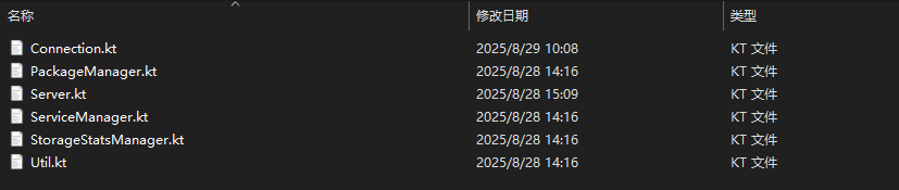 main方法在Server.kt中。在 Android 平台上,当一个 Java/Kotlin 程序通过CLASSPATH运行并带有main方法时,它会被系统启动为一个独立的进程。这个进程会拥有自己的 Dalvik 或 ART(Android Runtime)虚拟机实例。 - 本地套接字服务器: 这个进程创建了一个