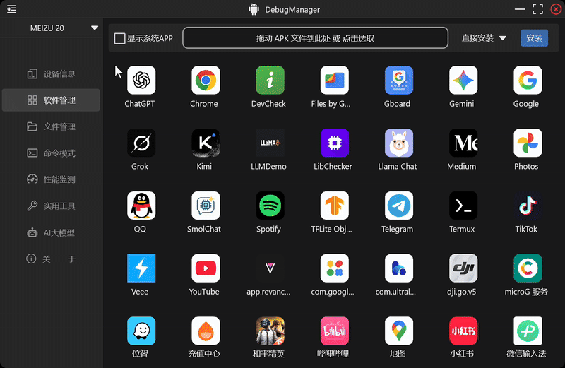 DebugManager内部,通过 adb shell pm list packages 命令,获取到所有安装的应用列表。解析出每一个包名,再调用服务端的 getPackageInfo 方法,获取应用label,版本信息。最后通过coil的AsyncImage组件,填入icon文件路径,异步加载图标。