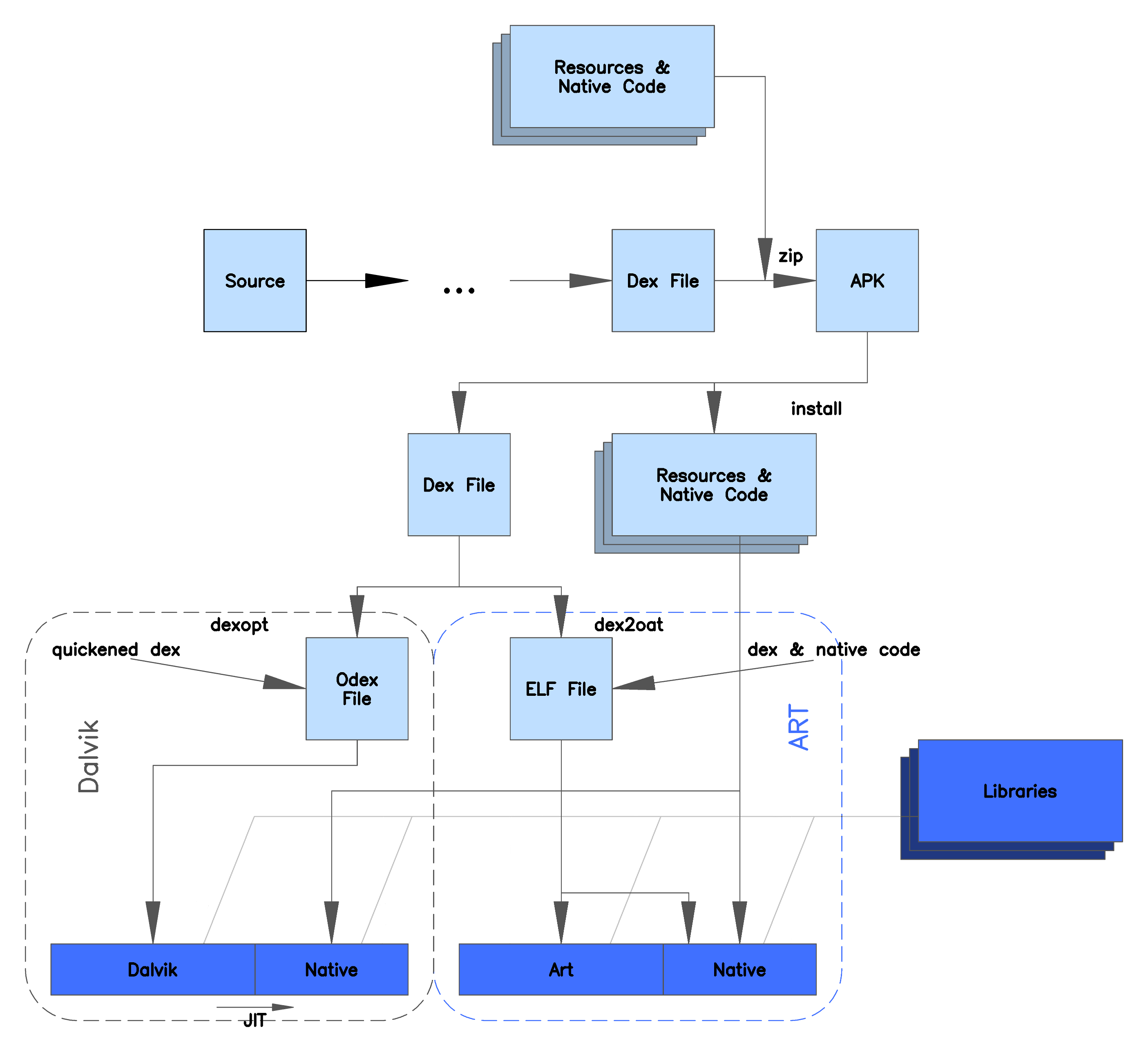 下图描述了Dalvik虚拟机与(Android 5.0上的)ART虚拟机在安装APK时的区别: