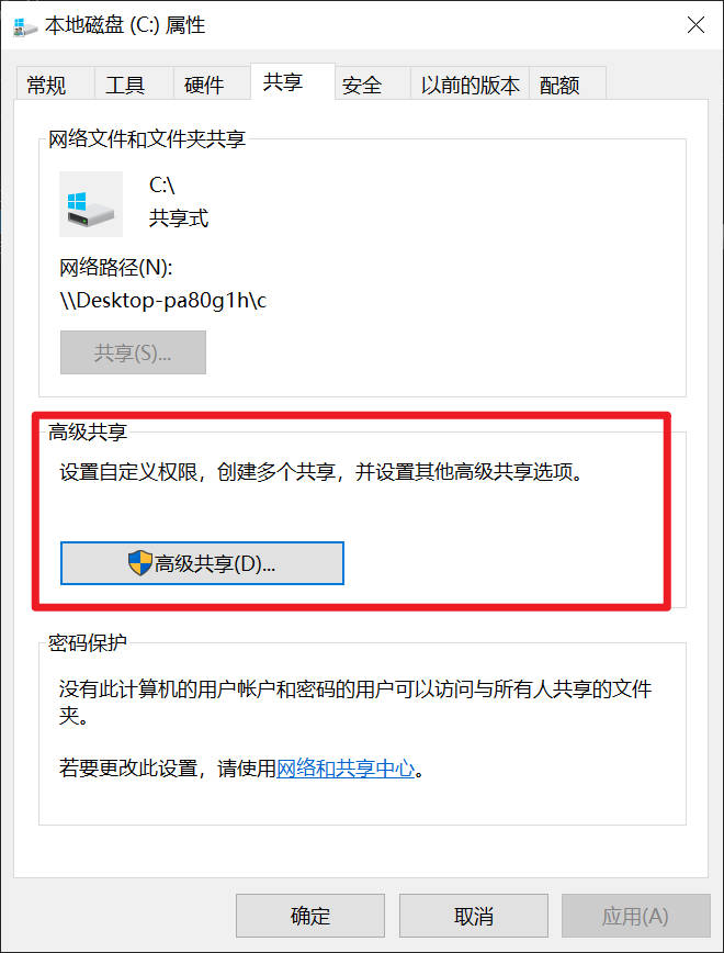 点击高级共享,勾选“共享此文件夹”,然后点击“权限”。