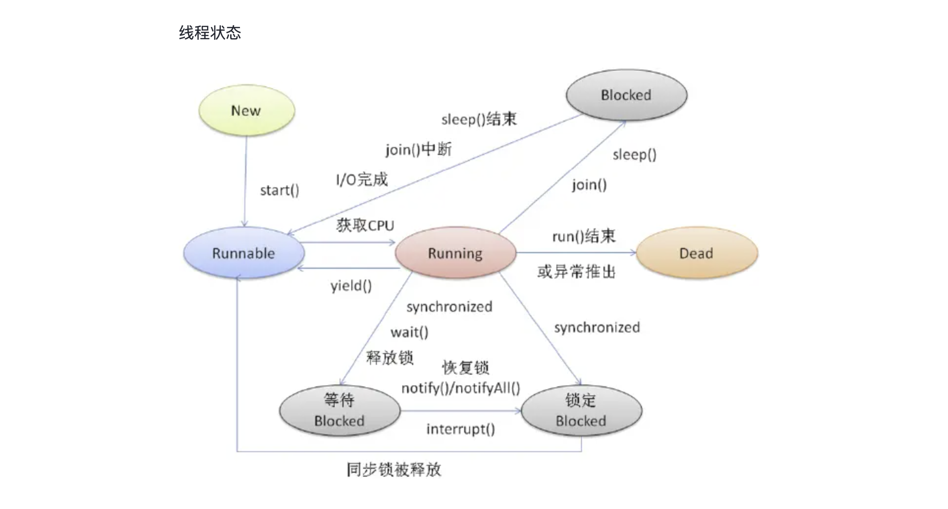 • Running 状态的线程加同步锁(Synchronized)使其进入(lock blocked pool),同步锁被释放进入可运行状态(Runnable)。