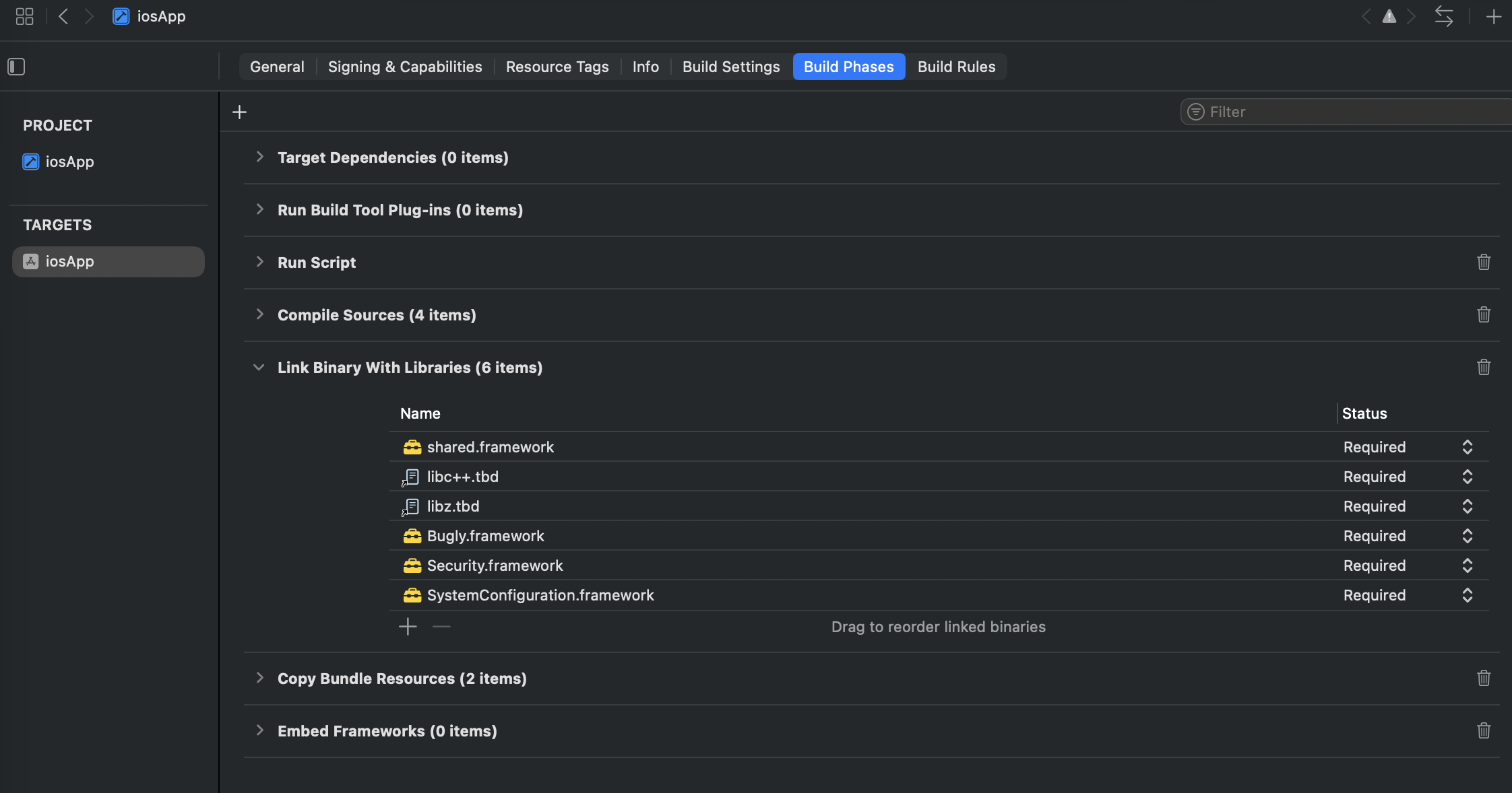 然后在项目的 build phase 板块的 Link Binary With Libraries 中添加 Bugly.framework。还有: