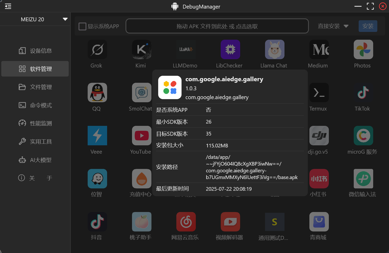 DebugManager内部,通过 adb shell pm list packages 命令,获取到所有安装的应用列表。解析出每一个包名,再调用服务端的 getPackageInfo 方法,获取应用label,版本信息。最后通过coil的AsyncImage组件,填入icon文件路径,异步加载图标。